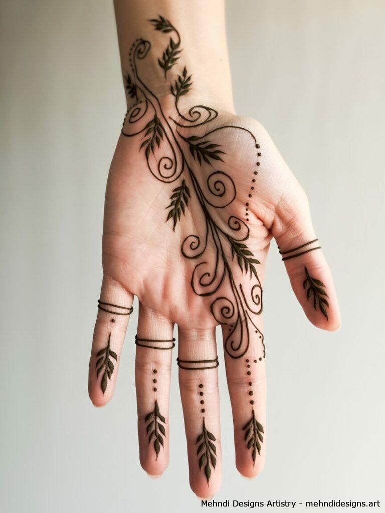 Simple mehndi design on palm with swirls and finger bands A minimal mehndi design featuring swirling vines along the palm with dotted accents and simple leafy motifs with band patterns on the fingers.