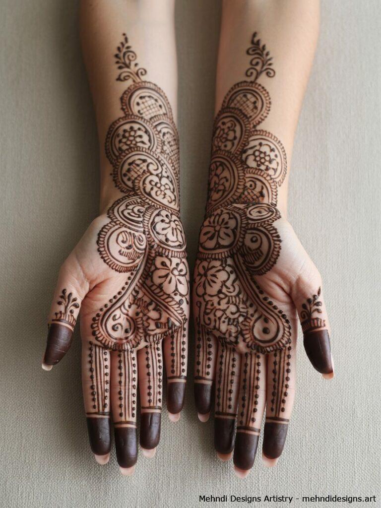 Intricate floral mehndi on palms and wrists Elegant mehndi with paisleys, florals, vines, and bold fingertip fill covering the palms and extending up the wrists in a detailed symmetrical style.