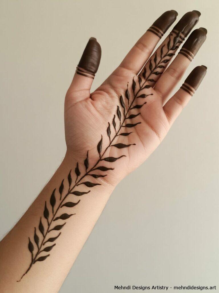 Simple leafy vine mehndi on palm and wrist Elegant mehndi design of leafy vines flowing from wrist to palm and fingers, featuring neatly spaced leaves in a simple botanical style.