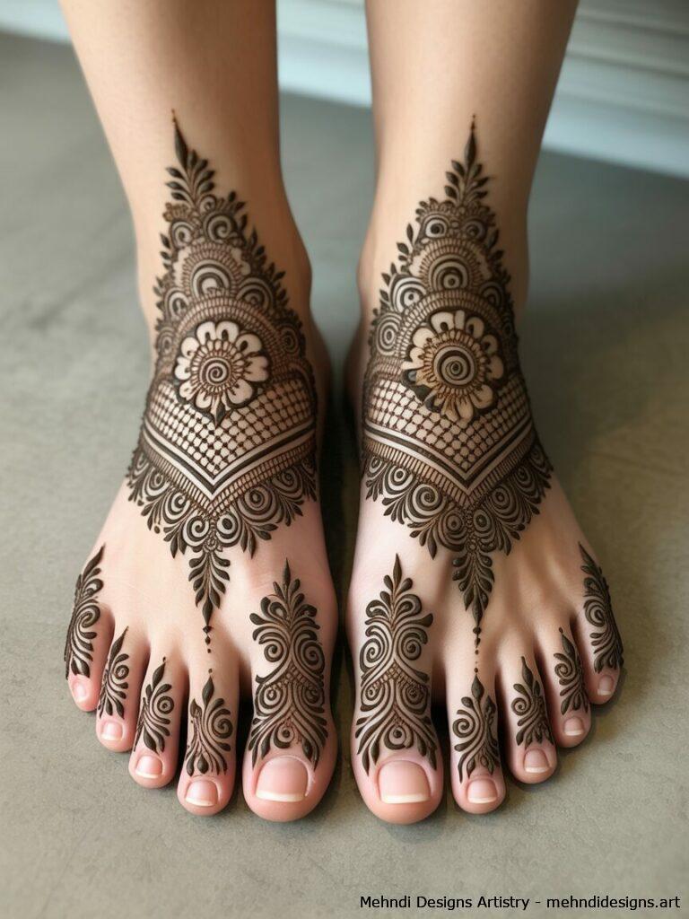 Intricate foot mehndi with paisleys, circular motifs, and fine detailing extending from toes to ankles in a structured, symmetrical pattern.